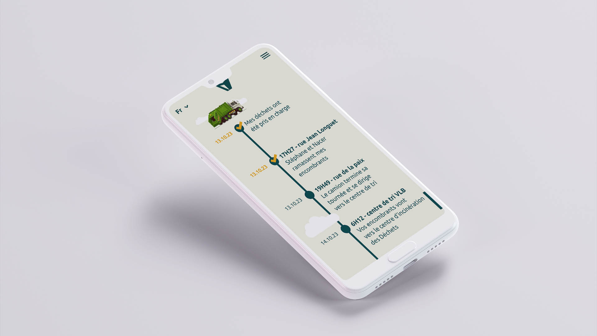 Des graphismes minimalistes, des formes simples et rondes et des chromies en lien direct avec la thématique pour dessiner ici un véritable tableau de bord qui permettra à l’utilisateur de gérer ses encombrants mais surtout de suivre leur ramassage, leur acheminement jusqu’à un site où ils seront traités.